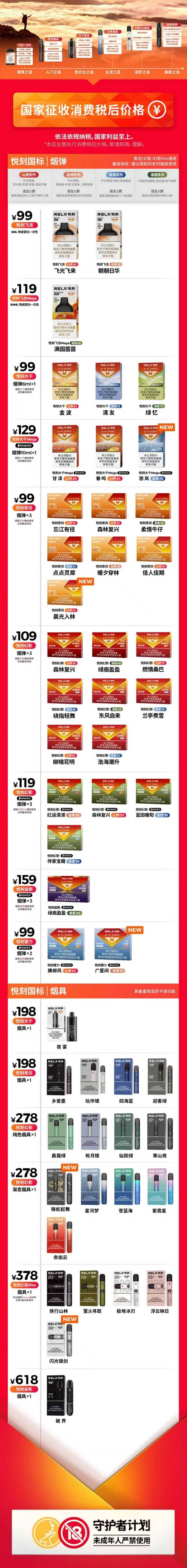 再者,产品视觉与文案共同营造了一种“轻负罪感”的消费语境。淡雅的色彩搭配、艺术化的品名、强调“风味”与“体验”,都在试图剥离电子烟与传统吸烟的负面健康联想。页面底部的“守护者计划”与“未成年人严禁使用”的标识,则是一种必要的合规姿态与社会责任展示,意在平衡产品的成瘾属性与商业伦理的边界,塑造一个负责任、有管控的现代品牌形象。